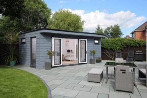 As with all of our buildings, this Garden Room is completely bespoke and designed for the specific functional and aesthetic needs of the client. A fabulous feature of this particular design is the obtuse angle along the front wall. It opens the building a little more to the patio and breaks up the outline creating a treat for the eyes.