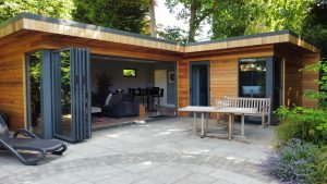 In addition to the beautifully decorated and furnished main area there is a substantial office creating an L shape which nestles into the corner of the garden as a subtle feature to compliment the garden. The striking cedar clad design is accentuated with anthracite grey aluminium doors and windows. The garden office room has large windows to picture frame the view and can be accessed from the main room or independently so that work and home life can be kept separate. This client has an excellent sense of style and has chosen some fabulous furniture and art as well as developing a patio and planted area that finish the overall look in the garden and allow it all to work as a multi-functional space.