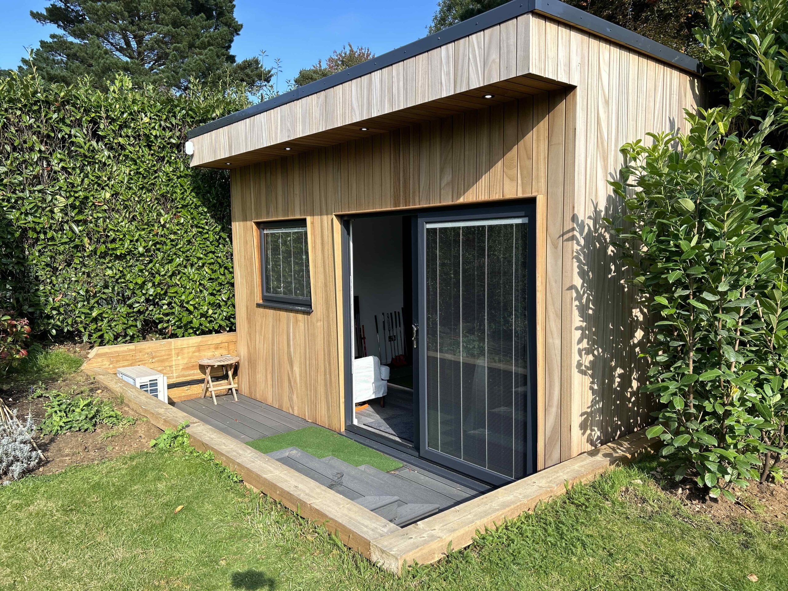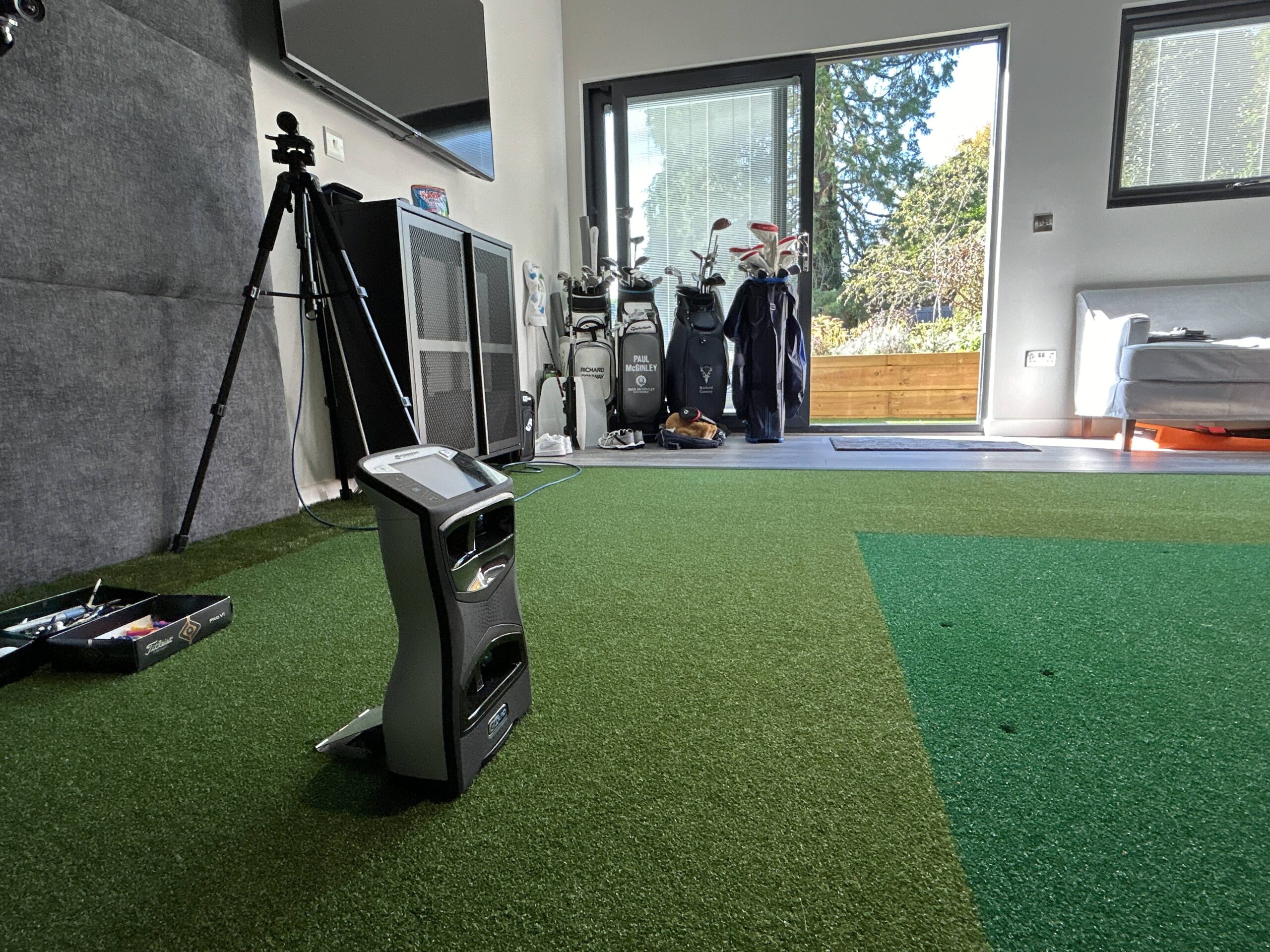 This building measures 7m x 5m and is 3.2m high which is the perfect size for all golfers to comfortably play. In order to comply with permitted development rules we dug below ground to 700mm and incorporated drainage so that the overall height from garden level to roof is 2.5m. It has a fully integrated GC Quad launch monitor system and plenty of space for a group to hang out and play.